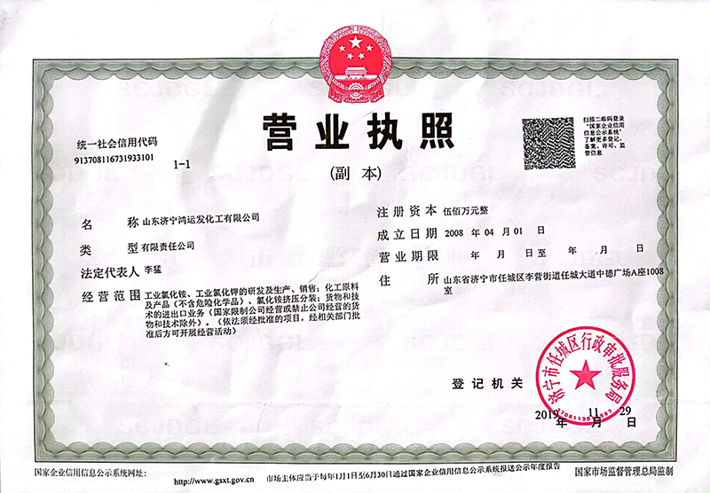 山東濟(jì)寧鴻運(yùn)發(fā)化工有限公司是一家13年的集生產(chǎn)與銷(xiāo)售為一體的化工企業(yè),主要生產(chǎn)與銷(xiāo)售工業(yè)氯化銨、飼料氯化銨、硫酸銨、工業(yè)氯化鉀以及三聚氰胺。